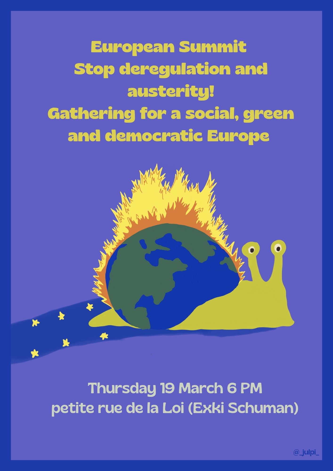 Le 19 mars se tient un nouveau Conseil Européen des chefs d'état où après le sommet informel de Alden Biesen , les 27 dirigeants européens vont formaliser leurs plans de lever tous les obstacles qui gênent la compétitivité et les profits des plus grandes entreprises. Face aux dérégulations et à l'austérité, nous appelons tous les mouvements sociaux européens à manifester le jeudi 19 mars de 18h à 19h30 à Bruxelles-Schuman ( à hauteur d'Exki) pour une Europe sociale, écologique et démocratique. Nous avons le soutien d'un réseau d'ONG et syndicats européens contre la dérégulation https://www.generations-futures.fr/actualites/470-organisations-dereglementation/ Face à la destruction de nos acquis sociaux et environnementaux et aux victoires de l'extrême droite et des lobbies, nous devons rétablir un rapport de force démocratique et viser une victoire des partis progressistes lors des prochaines élections européennes en 2029. En tant que citoyens et associations basés à proximité des institutions européennes, nous avons le devoir de nous mobiliser et de résister. Cette action vise à encourager la participation citoyenne et de préférence la plus massive possible. Plus de détails sur l'appel proposé ici https://docs.google.com/document/d/1eowOmmAEJR5cMQpc3JIur_UBfzaqfPjkboz-QdgWoTc/edit?usp=drivesdk Événement Facebook https://www.facebook.com/share/17zb2XMKqz/ https://www.instagram.com/p/DUyecmlCNe2/?igsh=NmtsZzMybzkxOXlr
